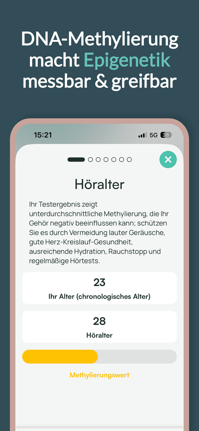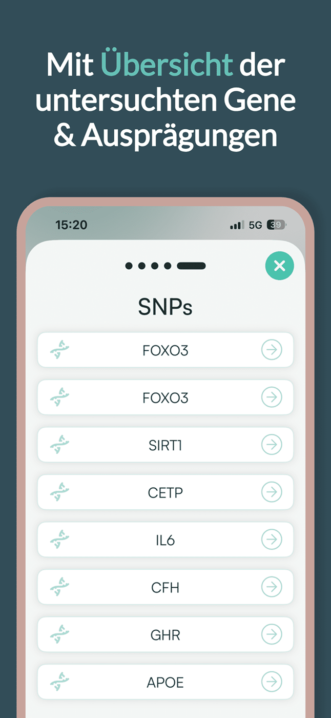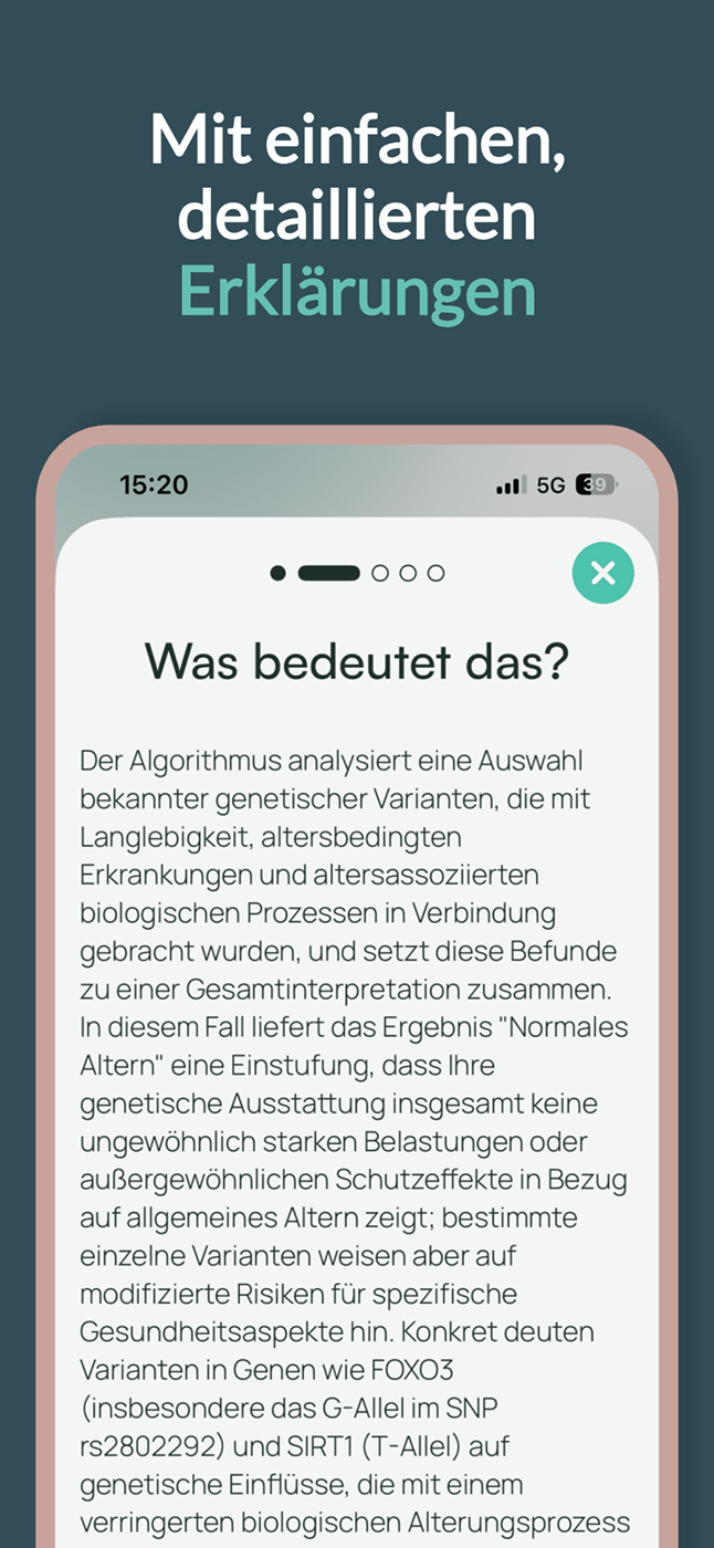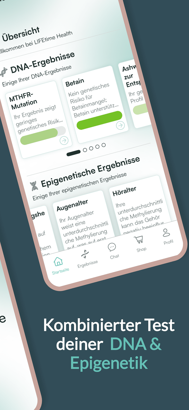 Du bekommst eine persönliche Auswertung deiner genetischen Voraussetzungen und epigenetischen Signale, verständlich in der App erklärt. So triffst du Entscheidungen, die zu dir passen.