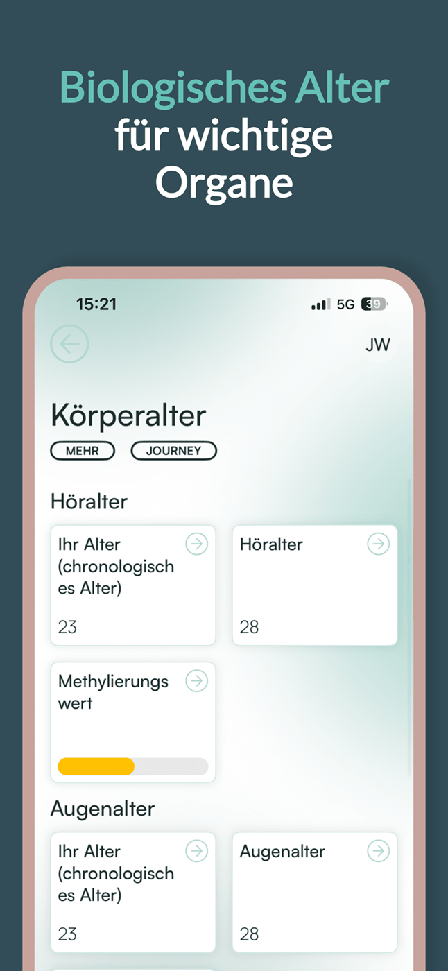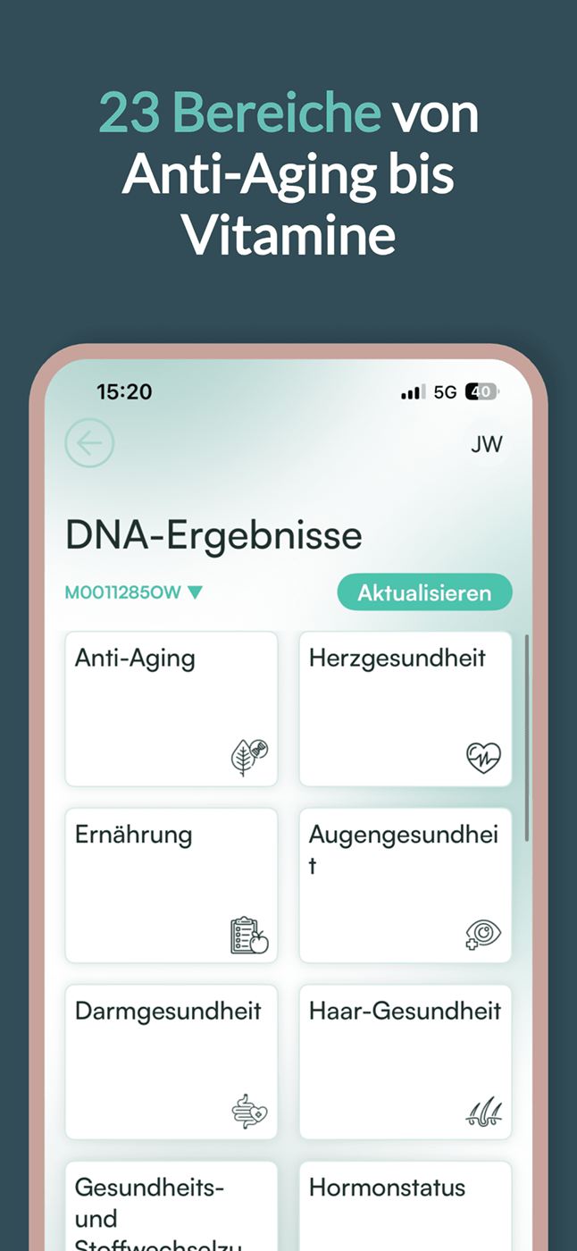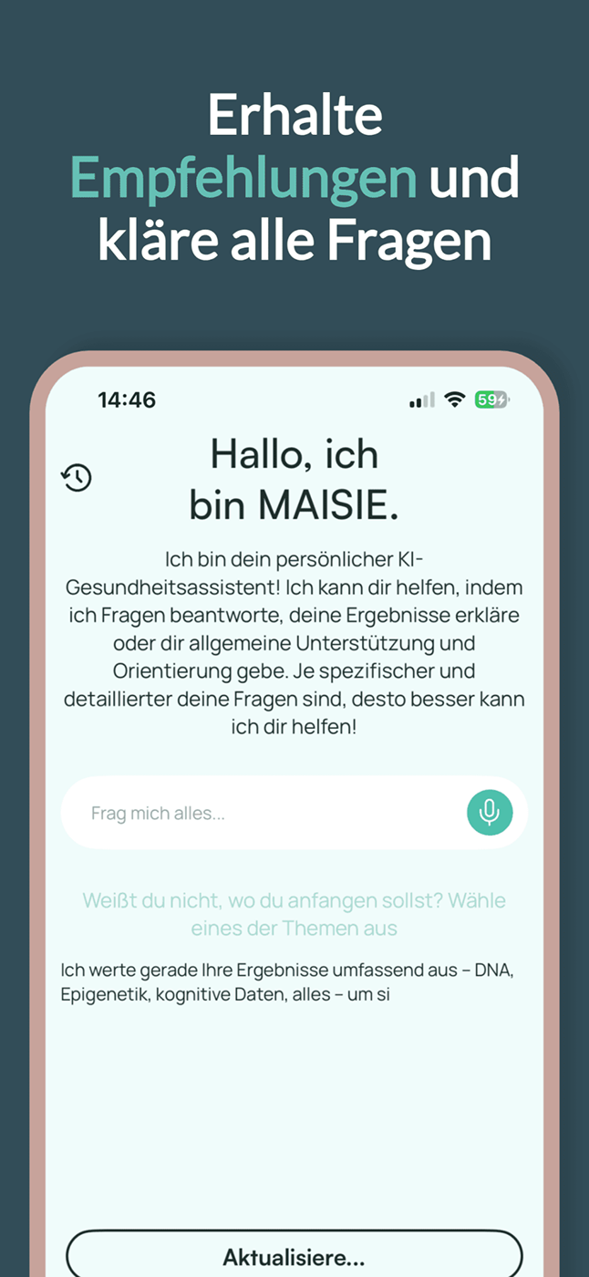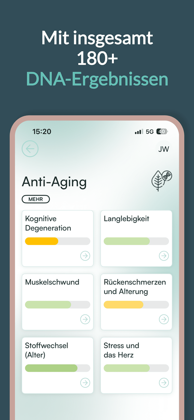 Du bekommst eine persönliche Auswertung deiner genetischen Voraussetzungen und epigenetischen Signale, verständlich in der App erklärt. So triffst du Entscheidungen, die zu dir passen.